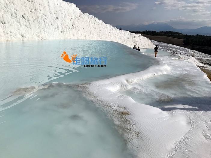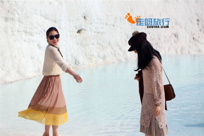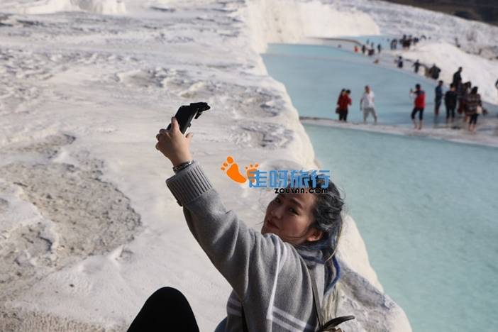 汽车穿过蜿蜒的山里,我把希望前行。当我光着脚踏入这边洁白的土地,它让我欣喜若狂,于是,我一个人边拍照往尽头走,因为季节关系,加上据说白色的温泉水也越来枯少,很多池已经没有水,稍稍带来点遗憾,但并没有失望,失望的是时间太短,应该待到日落才撤的,当太阳的光芒一点点由金色变成绯红殷红桃红玫瑰灰,棉花堡会像一朵最绮丽的莲花,幻化出难以置信的光影奇迹:白色的岩面会被阳光点染出淡淡的色彩,而岩面中水波则忠实地记录下天空变幻的奇异色彩。