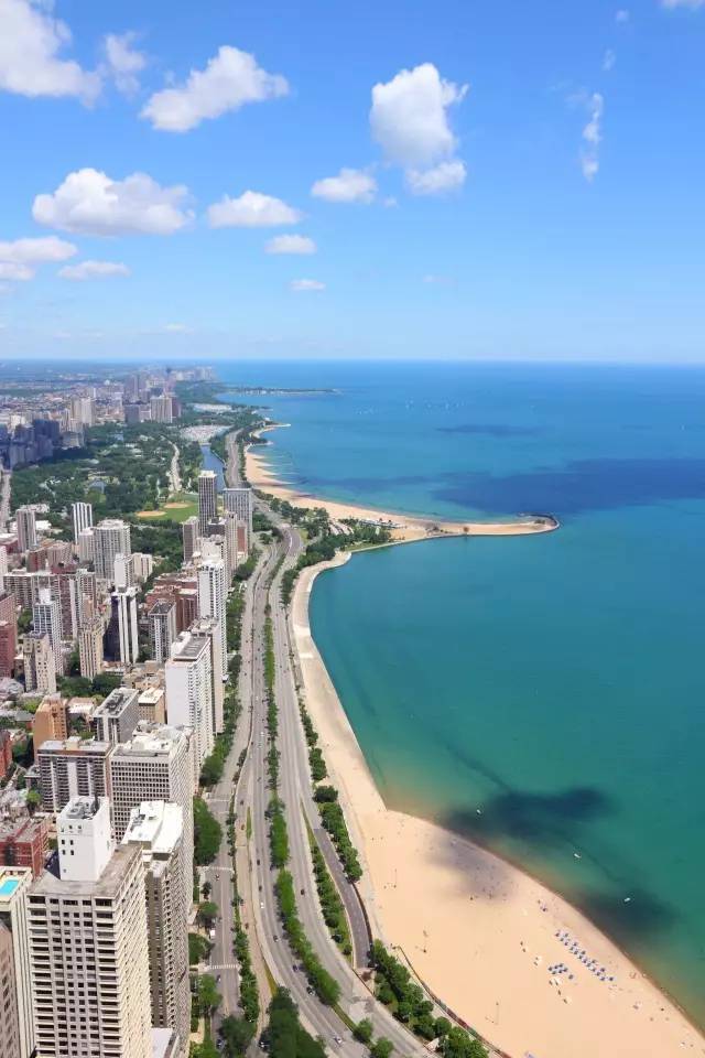 (芝加哥与五大湖之一的密歇根湖航拍,摄影师@Tupungato/123RF)