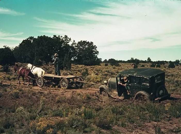 (一辆马车正努力拖拽陷入泥地的汽车,这张老照片拍摄于66号公路南部的新墨西哥州派镇,临近60号公路;摄影师@Russell Lee/美国国会图书馆)