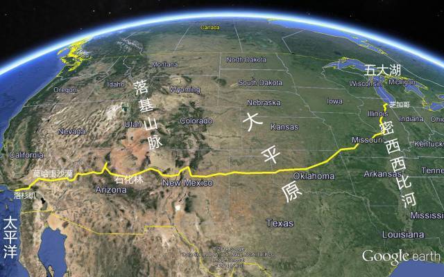 (66号公路示意图,地图源自@Google,星球研究所标注)