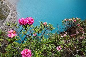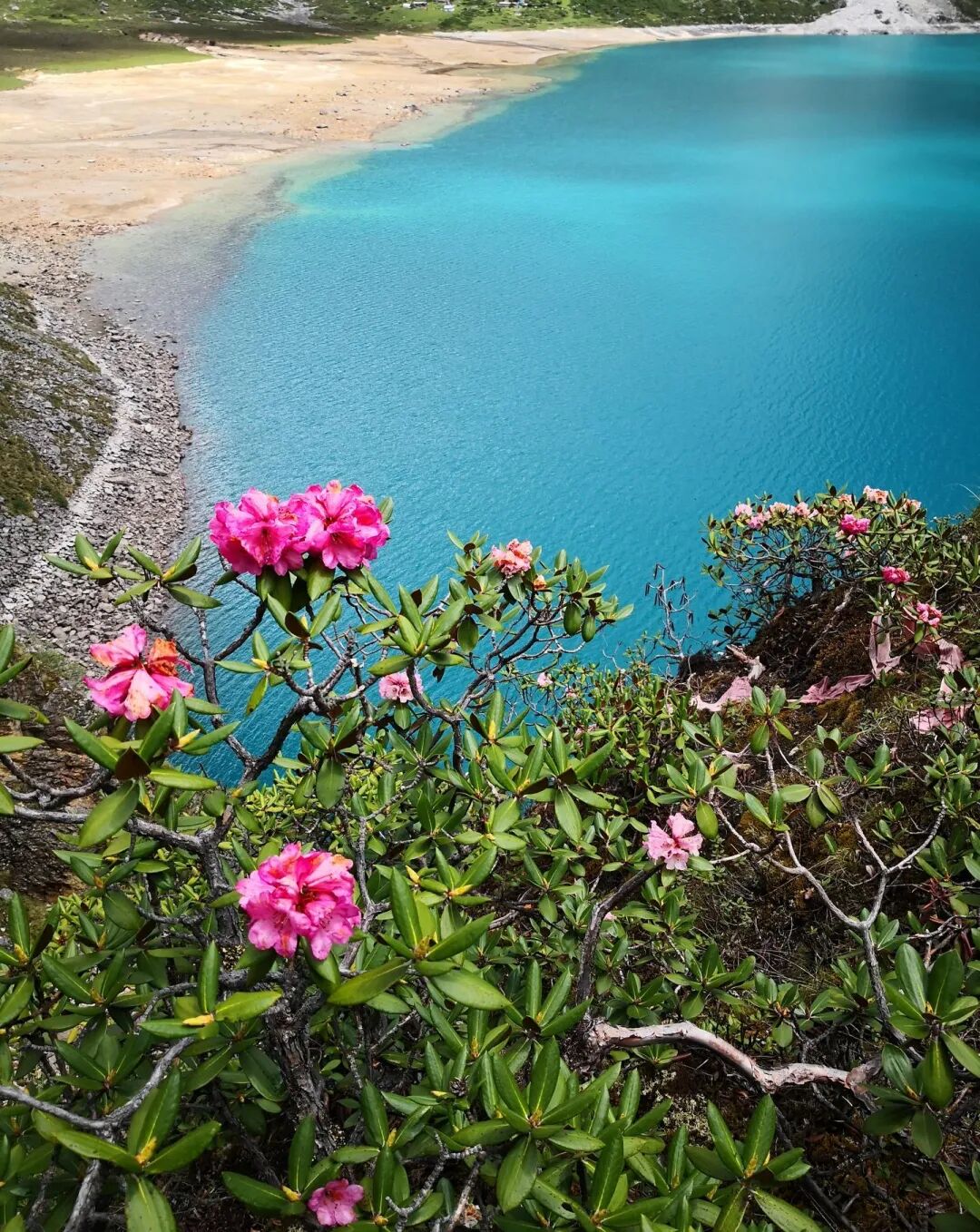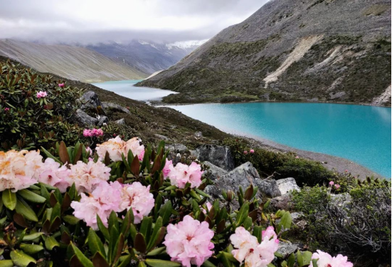 六月,在山南错那县勒布沟、洛扎县库拉岗日雪山脚下,雪山与杜鹃花的组合形成“冰与火”的视觉冲击:远处银色雪峰倒映在花海中,近处艳丽花朵与翠绿针叶林、溪流交织,构成层次丰富的画卷